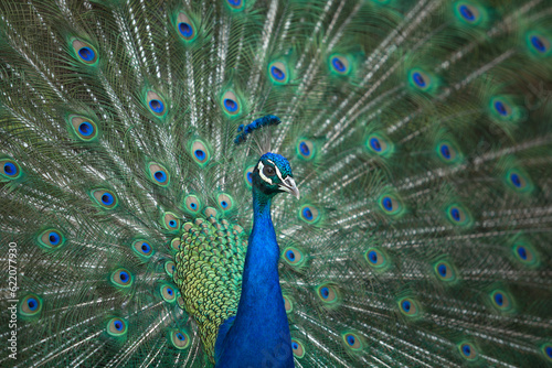Naklejka premium Claiming indian peacock with tail extended, Cordoba Zoo, Spain