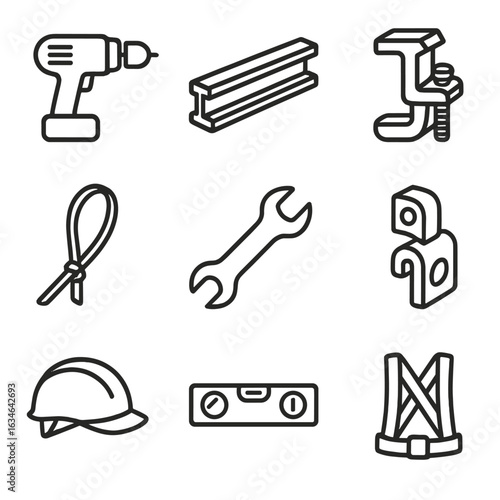 © Andrii, Fototapeta premium Clamp icons tools rail vector tie harness lug solar strap icon spanner