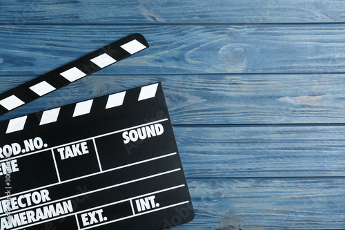 © New Africa, Obraz premium Clapper board on blue wooden background, top view with space for text. Cinema production