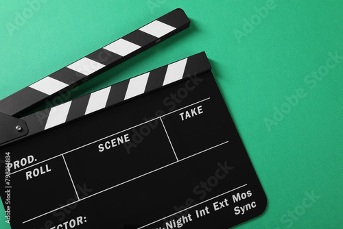 Obraz premium Clapperboard on green background, top view. Space for text