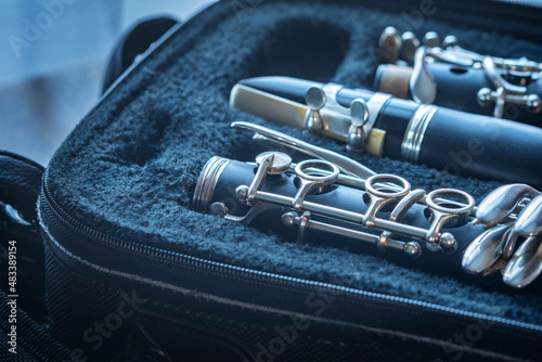 © Jevanto Protography, Naklejka premium clarinet inside musical instrument storage case closeup