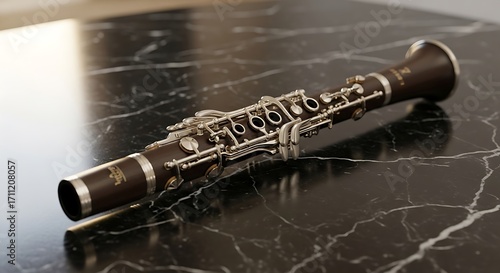 Naklejka premium Clarinet on Marble Surface, Evoking Music Culture, Classical Elegance