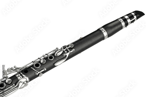 © ARTYuSTUDIO, Naklejka premium Clarinet woodwind instrument with chrome valve, close view. 3D graphic