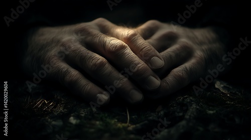 © Big9869, Fototapeta premium Clasped Hands in Dim Light Revealing Wisdom and Peace on Textured Surface of the Earth and Growth.
