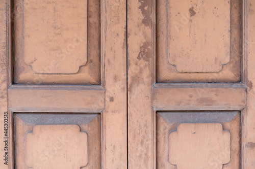 © Surachetsh, Naklejka premium Classic backdrop wood wall and door in front of Thailand vintage traditional Building.