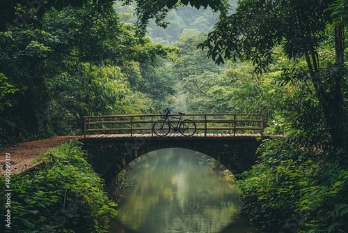 Fototapeta premium classic bicycle resting on old rustic bridge amidst dense greenery and reflecting water. soft daylight creates serene and soothing atmosphere, capturing quiet beauty of nature.