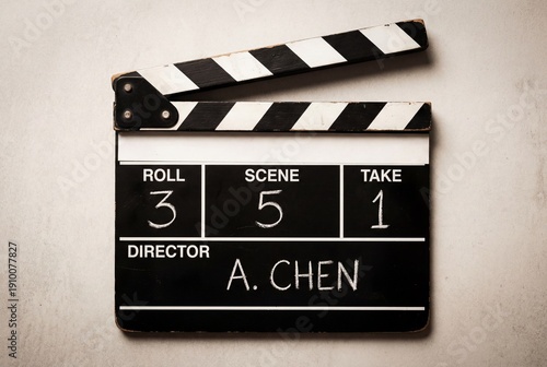 © Meow Creations, Obraz premium Classic black and white clapperboard for film production on a neutral background
