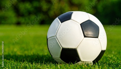 Fototapeta premium Classic black-and-white soccer ball resting on a grassy field with trees in...