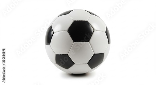 © Nguyen, Obraz premium Classic black and white soccer ball sharply lit against bright white background. AI Generated