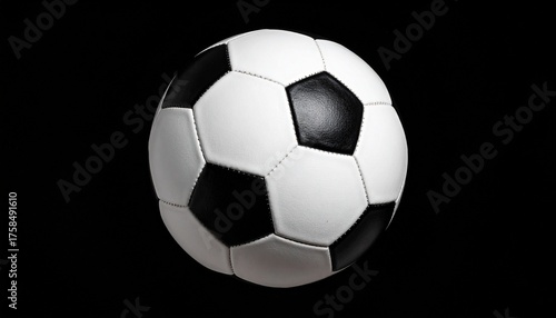 Fototapeta premium Classic black and white soccer ball with pentagon-hexagon pattern, isolated on solid black background