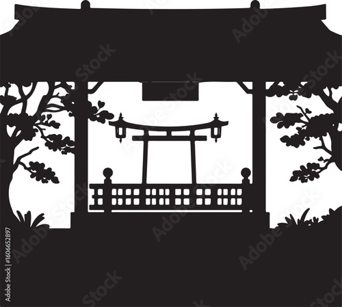 Fototapeta premium Classic black and white vector silhouette of a Japanese garden with lanterns on a white background. Modern flat design aesthetic, simple two-dimensional shapes, timeless and elegant.
