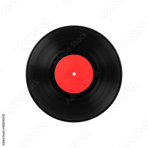 Fototapeta premium Classic black vinyl record with bright red label on transparent background