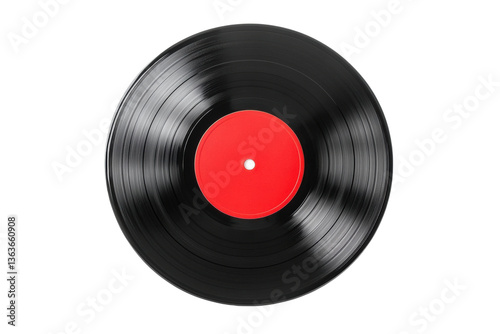 Obraz premium Classic black vinyl record with red label on black background, cut out