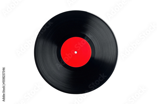 Obraz premium Classic black vinyl record with red label on black background, cut out