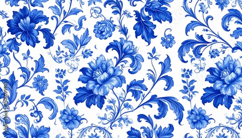© Sasarahiko, Obraz premium クラシックな青い花柄パターン(トワル・ド・ジュイ風) / Classic Blue Floral Pattern (Toile de Jouy Style)