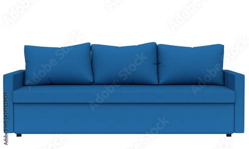 Fototapeta premium Classic blue sofa with soft pillows on a white background. Front view. 3d...