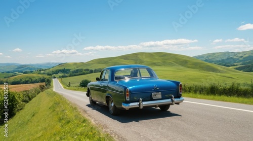 © Anupong, Fototapeta premium Classic Blue Vintage Car on Scenic Country Road Under Bright Sunlight