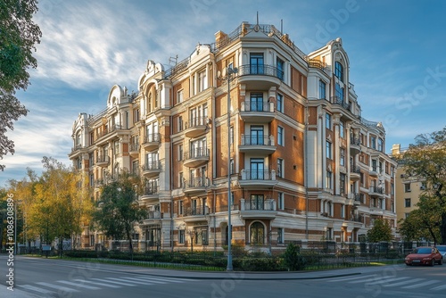 © Abdul, Naklejka premium Classic brick building with ornate details on a corner lot.