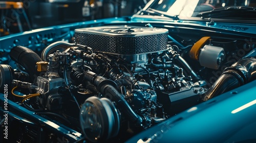 Obraz premium Classic car engine displayed in garage during restoration project showcasing...