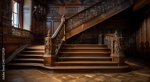 Obraz premium Classic Carved Wooden Staircase in Traditional Home