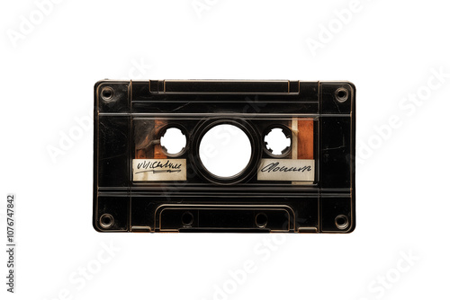 © DBFilms, Fototapeta premium Classic cassette tape close-up with a slightly worn look, visible details on label, isolated on a black background.