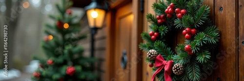 © Katherina, Fototapeta premium Classic Christmas wreath with red berries & pine cones hangs on a wooden door Festive lights blur , celebration, door, pine