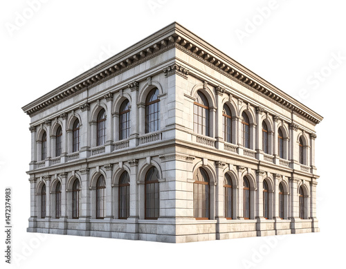 Fototapeta premium Classic Corner Building: An elegant, three-story corner building showcasing classic architectural details, including arched windows, ornate cornices, and a stately facade.