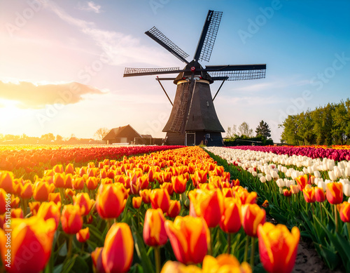 © Diana, Naklejka premium Classic Dutch Windmill in a Vibrant Tulip Field at Sunrise