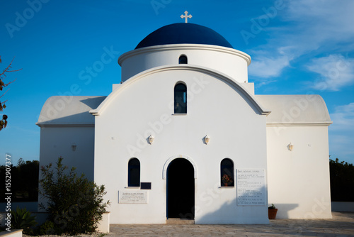 Fototapeta premium Classic Greek Orthodox church with white walls and a blue dome. Saint Nicholas Church in Paphos, Cyprus. Concept of Mediterranean culture, religious heritage