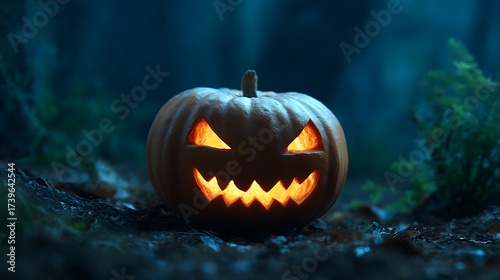 Naklejka premium Classic Jack-o'-Lantern with a Carved Face Glowing in the Dark forest