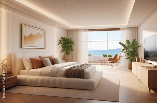 Fototapeta premium Classic luxury room interior in white and beige shades. Bed, large window