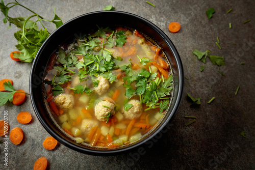 Naklejka premium Classic meatball soup with potatoes, carrot and greens.
