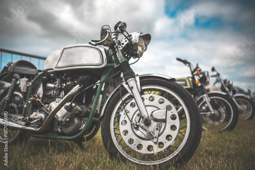 Fototapeta premium Classic motorcycles parked on grass under a cloudy sky