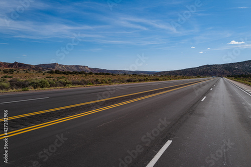 © Volodymyr, Naklejka premium Classic panorama view of an endless straight road running through the barren scenery of the American Southwest.