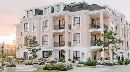 Fototapeta premium Classic pastel residential building at dawn — architecture of a housing complex, morning light and cozy neighborhood.