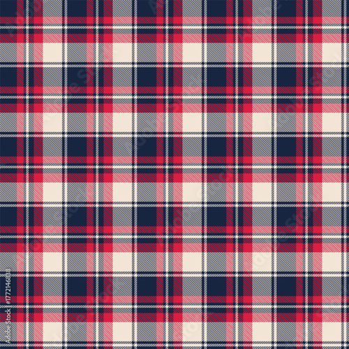 Fototapeta premium Classic plaid fabric pattern in navy, red, and cream with balanced...