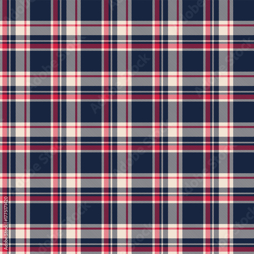© nooumaporn, Fototapeta premium Classic plaid fabric pattern in navy, red, and cream with balanced crisscrossed lines, ideal for seamless fashion and cozy textile designs