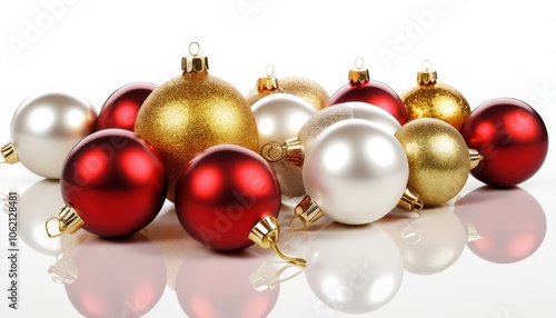 © PinoyCapture, Fototapeta premium Classic red and gold Christmas baubles scattered on a white background, each ornament shining with reflective highlights, capturing a festive holiday glow.