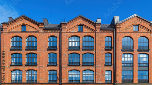 © Jean Isard, Fototapeta premium Classic Red Brick Multi-Story Building on Clear Day