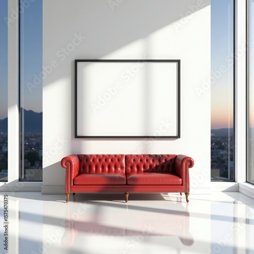 © Reazy Studio, Fototapeta premium Classic red leather chesterfield sofa with button tufting and wooden legs for living room decor accent