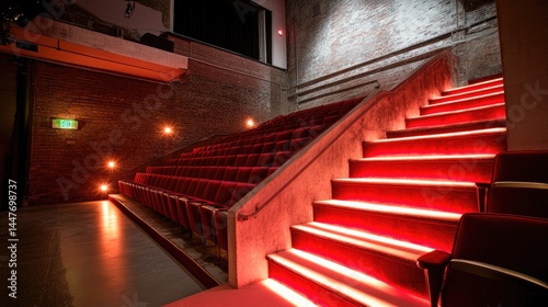 Obraz premium Classic red velvet theater seats with aisle lights glowing faintly, silent before a show begins