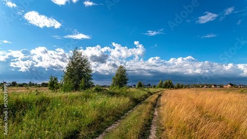 © sergofan2015, Obraz premium Classic rural landscape with road. Green field against blue sky with clouds.
