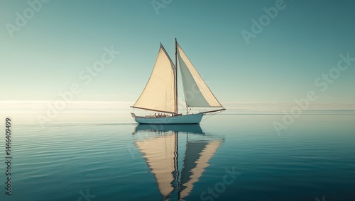© Fauzi, Obraz premium Classic sailboat glides serenely on calm ocean waters, reflecting its beauty