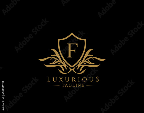 Fototapeta premium Classic Shield Logo With F Letter. Elegant Shield badge With Floral Shape perfect for fashion, Boutique, Jewelry, Hotel, Restaurant.