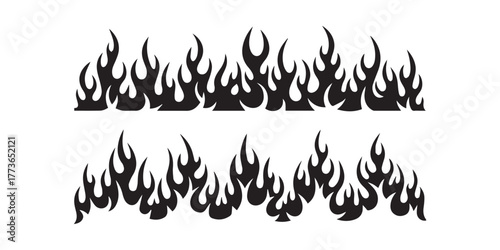 © SujetaRani, Fototapeta premium Classic silhouette flame. Black fire set isolated on white background. Old school tattoo neo-tribal style or silhouette flame for cars. Minimalistic stylish fire outline and filled contour. Vector set