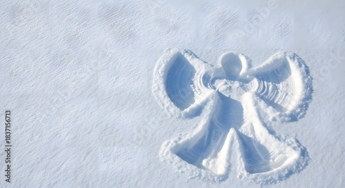 Naklejka premium Classic snow angel imprint pressed into pristine white snow from an overhead view, depicting a winter fun concept and joyful outdoor activity