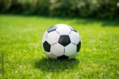 Fototapeta premium Classic soccer ball on artificial green grass