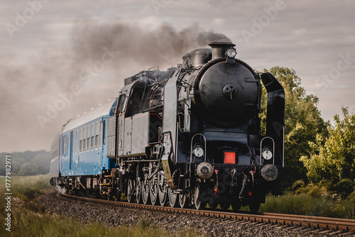 © rebius, Naklejka premium Classic steam locomotive moving. History and power on the rails.
