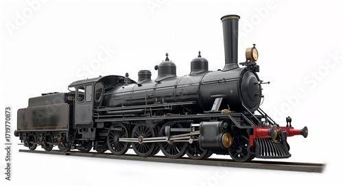 Fototapeta premium Classic steam locomotive with tall smokestack large wheels and front lantern detail on plain white background