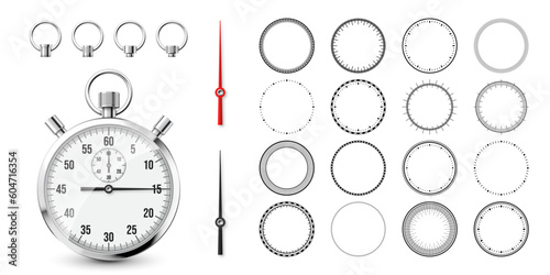 Naklejka premium Classic stopwatch with clock faces. Shiny metal chronometer, time counter with dial. Countdown timer showing minutes and seconds. Time measurement for sport, start and finish. Vector illustration